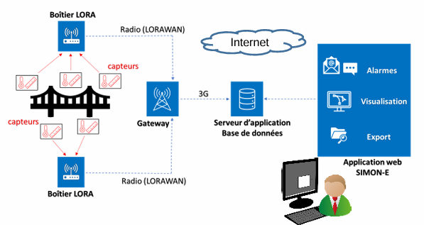 Trois capteurs peuvent être pris en charge par un seul boitier électronique permettant ainsi une réduction significative des coûts de mise en oeuvre et de déploiement. En plus du déplacement, le boitier mesure aussi la température. L’alimentation du boitier avec deux piles Lithium autorise des autonomies jusqu’à plusieurs années selon le paramétrage choisi. Le protocole radio utilise la norme LoRaWAN conçue pour l’IOT (longue portée, faible consommation, bas débit)