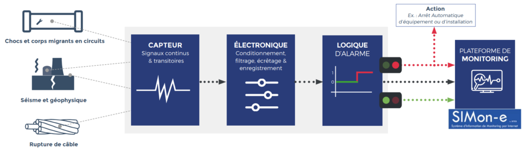 Dans le secteur nucléaire : Système SIS ou KIR, dont la fonction est la détection de la présence de « corps migrants », à l’intérieur du circuit primaire en fonctionnement (300 bars, 400°C). Le système qui équipe les 58 tranches du parc nucléaire français procède à « l’écoute » des vibrations et du « bruit solidien » émis par un objet errant dans le circuit, non désiré, qui pourrait endommager les parties internes du réacteur. Cette surveillance est effectuée par 9 à 12 capteurs de type accélérométrique sur une gamme de fréquence de 15 kHz. Le filtrage, la discrimination du haut niveau de bruit ambiant et l’analyse temps réel de ces signaux permettent la classification des évènements pour alerter l’exploitant.